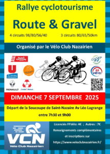 La météo clémente du dimanche 7 septembre a été un des éléments du succès de la matinée rallye du Vélo Club Nazairien. 105 cyclos ont trouvé leur bonheur parmis les 4 circuits proposés (98, 80, 56 et 40 km), tout comme les 53 graveleux avec leurs 3 circuits (80, 65 et 50km).